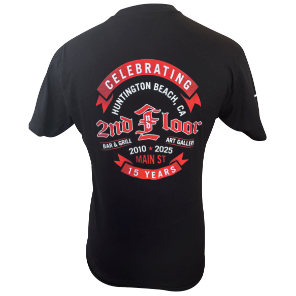 2ND FLOOR CELEBRATES 15 YEARS ON MAIN STREET IN 2025! LIMITED EDITION 15 YEAR ANNIVERSARY LOGO T-SHIRT PRINTED IN FULL COLOR ON BACK AND LEFT FRONT CHEST. ICONIC HB CITY LOGO PRINTED ON RIGHT SLEEVE IN WHITE. BLACK TSHIRT, SOFT HAND FEEL. SHOP FOR SNAPBACK HAT, LADIES TANK TOP, AND PULLOVER HOODIE COMPANIONS TO THIS COLLECTION.