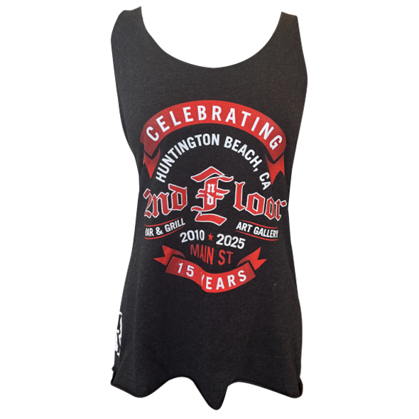 2ND FLOOR CELEBRATES 15 YEARS ON MAIN STREET IN 2025! LIMITED EDITION 15 YEAR ANNIVERSARY LOGO TANK TOP PRINTED IN FULL COLOR ON FRONT ANDUPPER BACK. ICONIC HB CITY LOGO PRINTED ON RIGHT HIP IN WHITE. VINTAGE BLACK TANK TOP, SOFT HAND FEEL. SHOP FOR SNAPBACK HAT, TSHIRT, AND PULLOVER HOODIE COMPANIONS TO THIS COLLECTION.