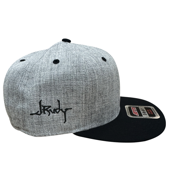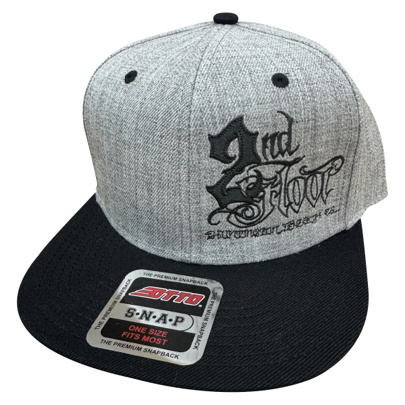 2ND FLOOR LOGO DESIGNED BY JACK RUDY EXCLUSIVELY FOR 2ND FLOOR. EMBROIDERED 2ND FLOOR LOGO ON FRONT AND JACK'S SIGNATURE ON THE SIDE. HEATHER GRAY/ BLACK SNAPBACK ADJUSTABLE CAP, BLACK THREAD.